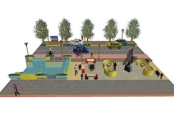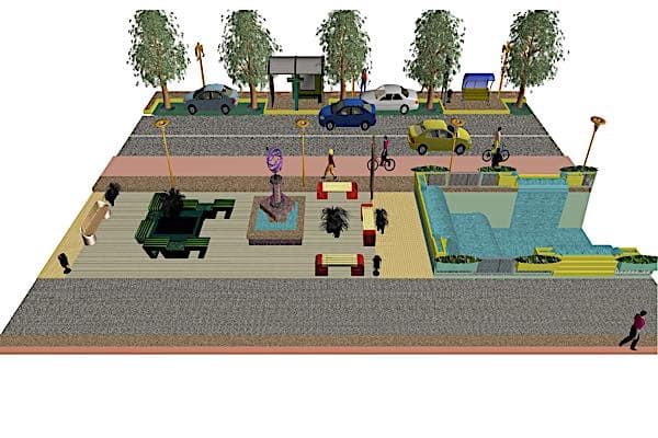 Στο μέσον της οδού δημιουργούμε μία νησίδα. Εκατέρωθεν αυτής δίνουμε την κίνηση του ποδηλάτου, συνεχίζουμε με κίνηση οχημάτων και στάθμευση πλούσια σε πράσινο μπρός και πίσω από κάθε σταθμευμένο όχημα. Το πράσινο τοποθετείται κάτω από κράσπεδο και δίπλα στο κρασπεδόρειθρο ώστε να μην εμποδίζει καμία κίνηση όπως γίνεται παντού σήμερα που σχεδιάζουν και κατασκευάζουν καταστρώματα οδών με « νεωτερικού τύπου» σχεδιασμούς. Ενδιάμεσα στο χώρο στάθμευσης τοποθετείται ο αστικός εξοπλισμός με στάσεις για τις γραμμές ΚΤΕΛ και mini-bus δωρεάν διαδρομών. Οι στάσεις απαιτούνται να κατασκευαστούν σε όλες τις λεωφόρους. Πρέπει να ληφθεί μέριμνα από όλους τους εμπλεκόμενους για να συνδεθούν με τα αστικά μέσα μεταφοράς και οι διαβιούντες στα οικιστικά σύνολα της επέκτασης. Να συνδεθούν οι διαβιούντες στην νέα πόλη με τα σχολεία τους, τις εκκλησίες τους και την παλιά πόλη. Τότε θα μειωθούν και οι άσκοπες μετακινήσεις προς την παλιά πόλη με τα Ι.Χ αυτοκίνητα όλων μας.