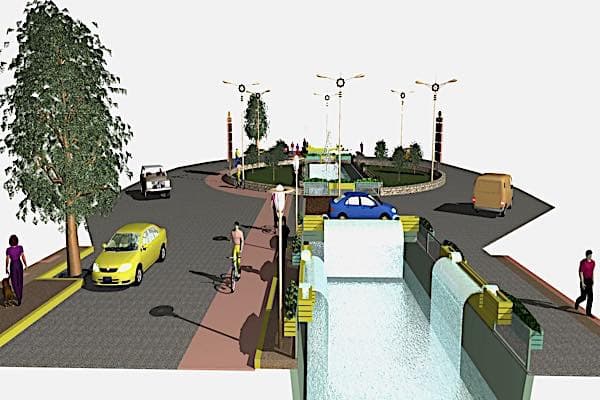 Συνεχίζουμε με την αρχιτεκτονική – βιοκλιματική σχεδιαστική ανάδειξη του κυκλικού κόμβου. Επίσης προτείνουμε στατική λύση για την γεφύρωση των δύο τμημάτων της διώρυγας που απαιτούνται για την δημιουργία και την κυκλοφοριακή λειτουργία του κόμβου. Γεφυρώνουμε την διώρυγα με δύο πλακοσκεπείς οχετούς μήκους 14,0μ. Ανατολικά και δυτικά στο τελείωμα του πλακοσκεπούς οχετού στο ύψος της στέψης του σχεδιάζεται και υπολογίζεται ένα ανοιχτό κανάλι για την δημιουργία καταρράκτη . Το ίδιο ανοιχτό κανάλι δημιουργείται σχεδιαστικά και υπολογίζεται στατικά και στα πλευρικά τοιχώματα της ανοιχτής διώρυγας για δημιουργία υδατοφρακτών. Επίσης στο σχέδιο που ακολουθεί φαίνεται και η αρχιτεκτονική διαμόρφωση του καταστρώματος της οδού καθώς και η διαχείριση της κίνησης σε αυτό.